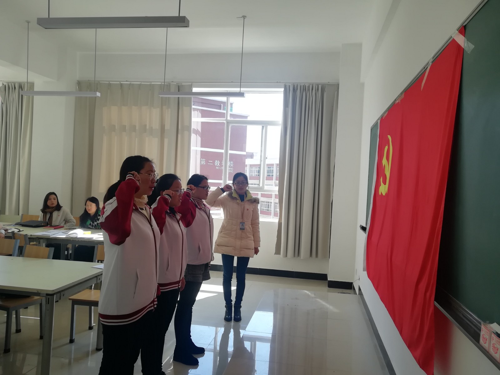 最后,通过支部大会决议,龚婷婷书记宣布经正式党员的一致同意三名发展对象转为预备党员。由龚婷婷书记领誓,三位预备党员面对党旗,举右手握拳擦肩宣誓。宣誓结束后,并为各位预备党员带上了党徽。