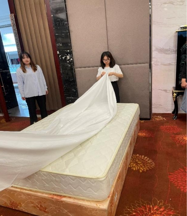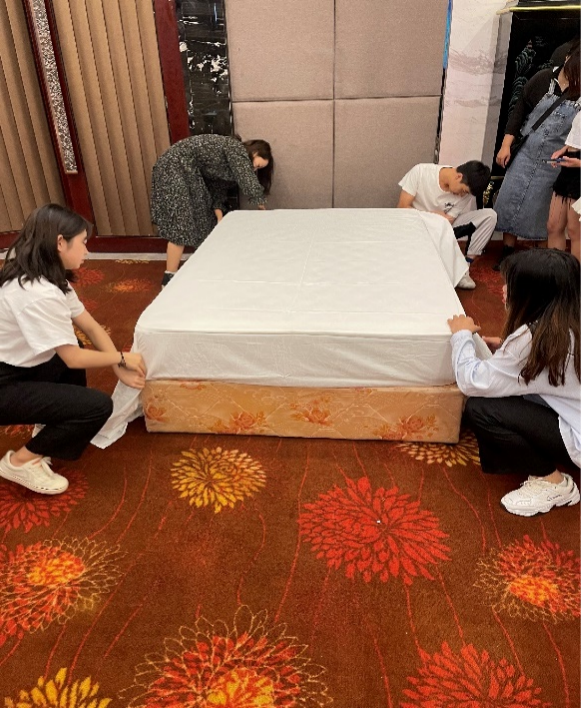 下午1:00,酒店客房部相关工作人员为同学们讲授了中式铺床知识,并带领同学们进行了实际操作,对客房日常铺床标准进行了耐心的指导。学生认真学习,反复练习,并相互协作,完成实训。