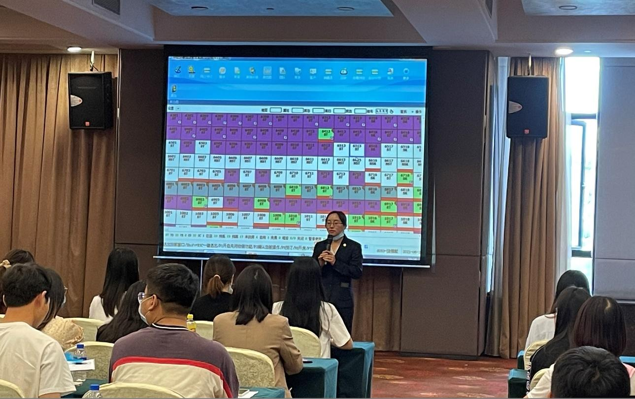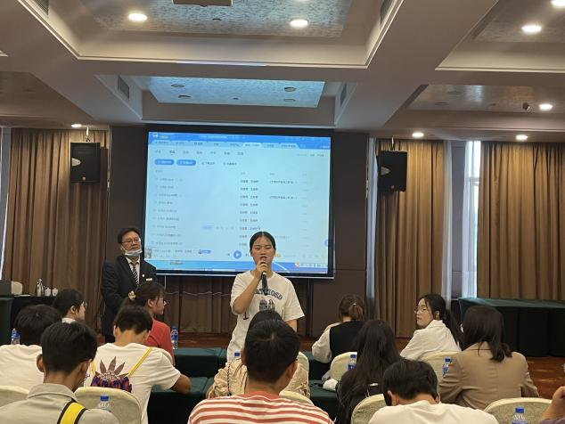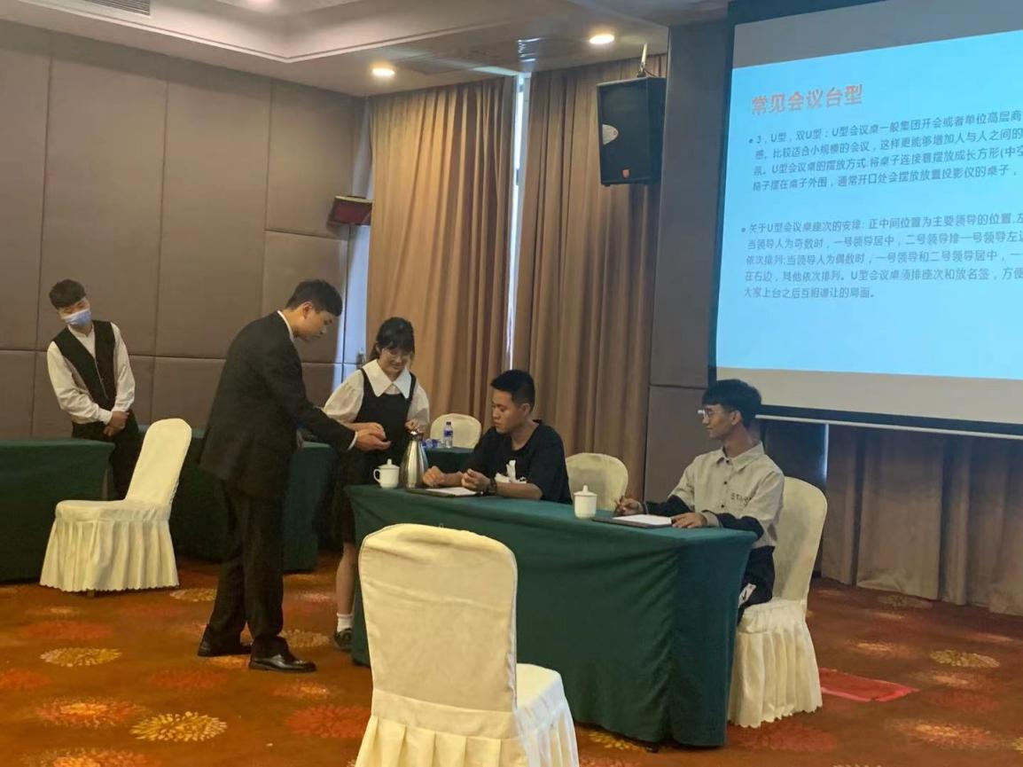 接下来,酒店宴会厅经理为同学们介绍了常见会议类型和常见会议台型,并带领大家进行了台型的布置,让大家亲身实践和体验酒店会议台型台面布置的规范和要点。