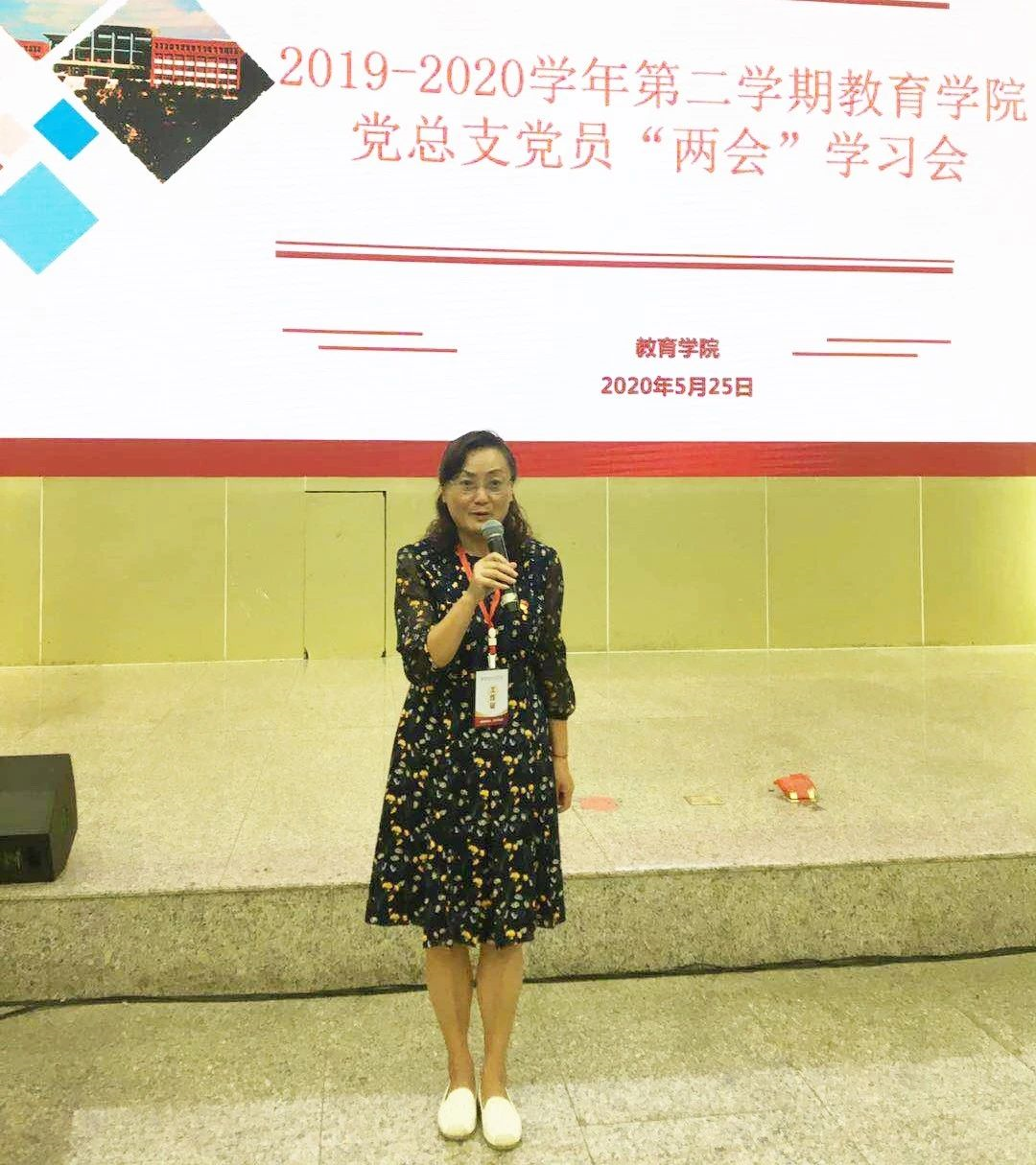 - 5月25日,2019-2020学年第二学期教育学院党总支党员两会学习会在图书馆300报告厅举行,教育学院党总支书记金明华、院长崔立华、副院长萧敏、副书记杨淑雯以及各支部党员参加会议。会上,教育学院全体参会党员认真学习了习近平总书记在全国两会期间下组团发表的重要讲话精神,学习了李克强总理所作的政府工作报告等内容。金明华书记指出,通过学习两会精神,我们更明确了教育的价值和意义,我们要培养的是具有创新精神的社会主义建设者和接班人,要把社会主义核心价值观落实到每一堂课和每一次主题活动中,要不遗余
